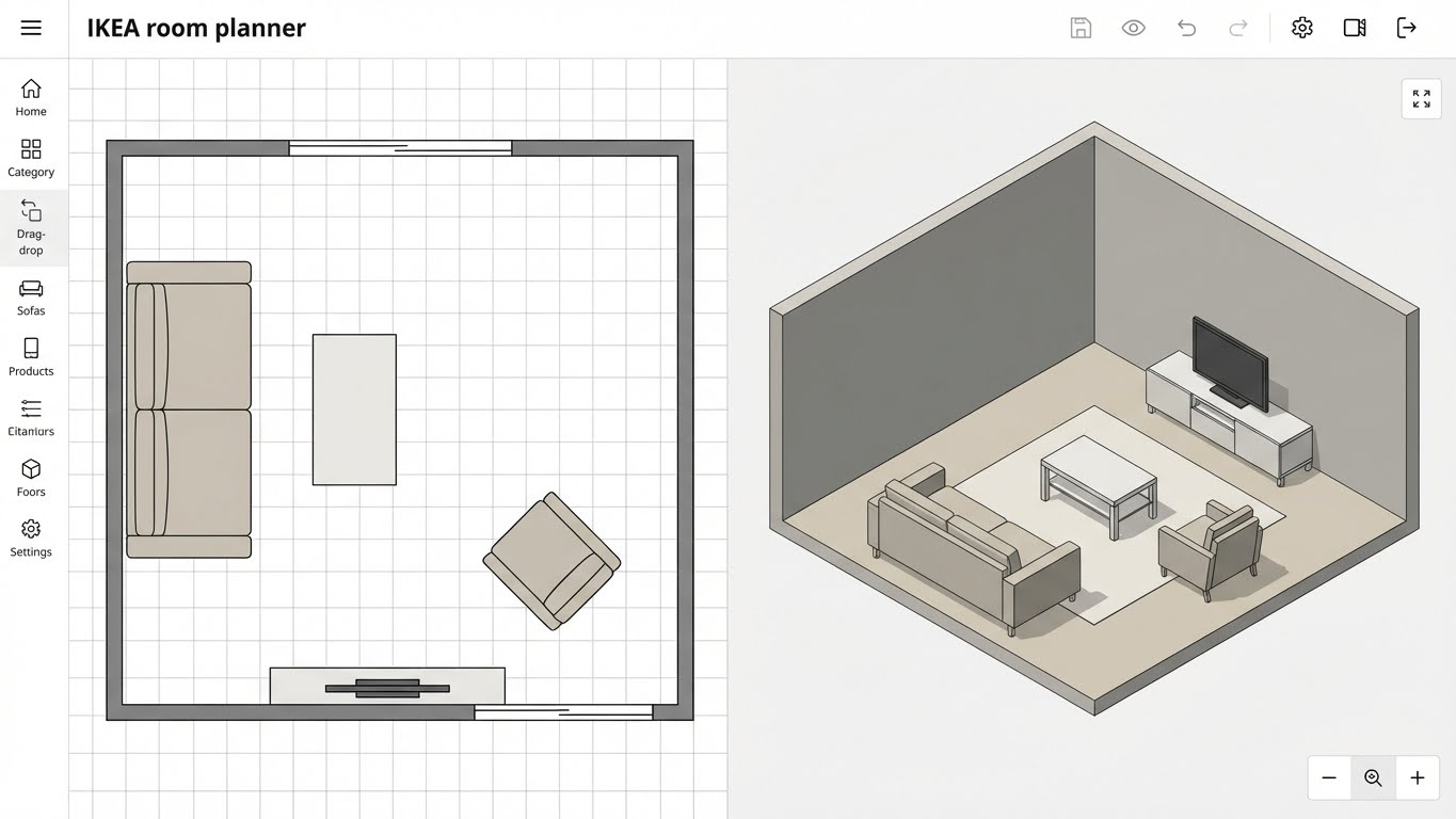 The IKEA room planner is an online design tool created to help users plan interiors using IKEA’s furniture catalog. Depending on the room type—such as living rooms, bedrooms, or kitchens—the planner allows users to place furniture items into a virtual layout and adjust dimensions to match their space.